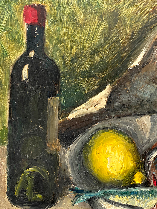 Peinture réalisée sur isorel, signée Lehr, 1959. Cette nature morte est très réussie, particulièrement la touche du peintre. Elle comporte quelques défauts (petits manque sur la queue d’un poisson) et trace de l’encadrement précédent. Mais c’est un vrai coup de cœur. J’aime beaucoup sa profondeur et sa composition. Idéal en collection/accumulation.