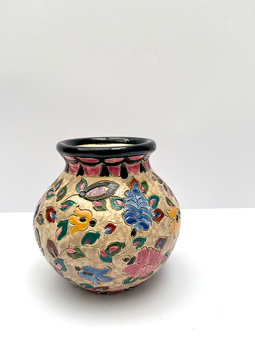 Vase ancien signé Massier Vallauris. Malheureusement il a une ébréchure au col. Mais comme son motif est vraiment fin et harmonieux, je vous le propose quand même à petit prix. Motif de fleurs émaillé. Tonalités beige et contour couleur chocolat. Une jolie pièce à marier avec d’autres vases.