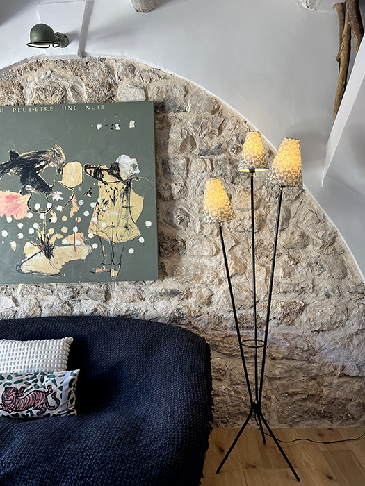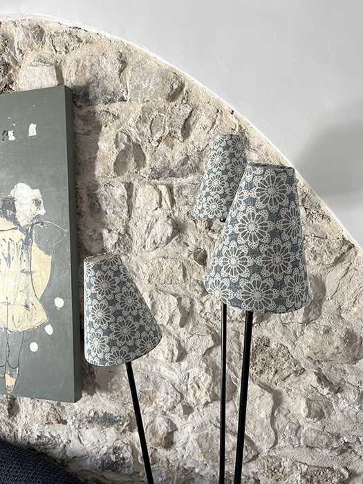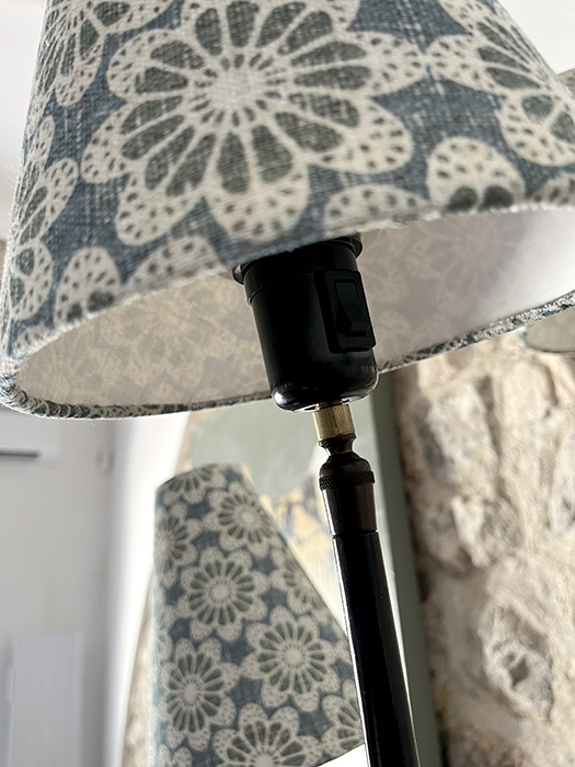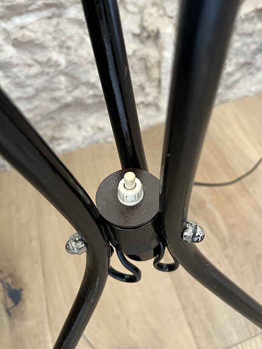 Lampadaire vintage années 60 en tube de métal noir creux. Il a été entièrement ré électrifié et traité anti rouille. Les 3 abat-jour ont été refaits avec un tissu neuf aux tonalités bleues et vertes. Tripode. Quelques traces d’usage. Interrupteur sur chaque branche.