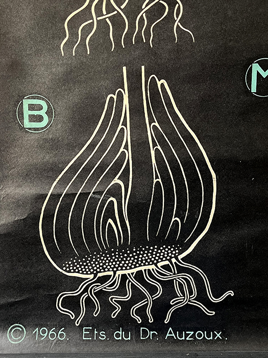Affiche scolaire représentant « La Moule». Affiche crée par le Dr Auzoux. Illustration par Paul Sougy. Affiche des années 50/60 sérigraphiée sur papier entoilé. Un grand classique du vintage. Très décoratif dans une chambre, une cuisine, un salon. Les affiches du Docteurs Auzoux sont reconnues pour être très colorées et contrastées par leur fond noir. L’affiche a un dos en tissu, et elle se fixe facilement grâce à son son ruban d’origine. Elle se roule aussi très facilement et reste roulée grâce à son autre ruban d’origine afin de la stocker facilement. Etiquette et support bois en haut et en bas. En état d’usage. Elles sont toutes datées et numérotées. Peut-être utilisé comme une toile panoramique.