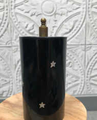 Porte cigarette noir et laiton. Le mécanisme fonctionne très bien. Incrustation étoile argentée. Il manque un petit support doré porte cigarette. Il y en a 17. Bon état général. Très original et décoratif