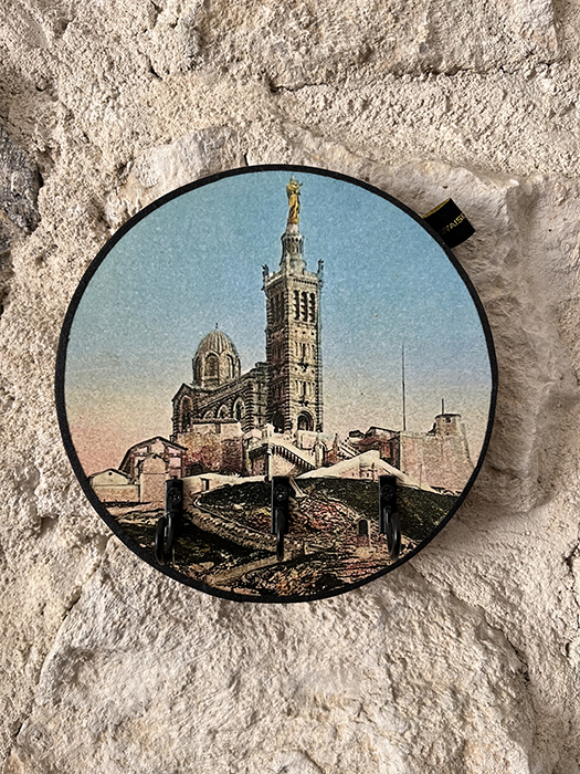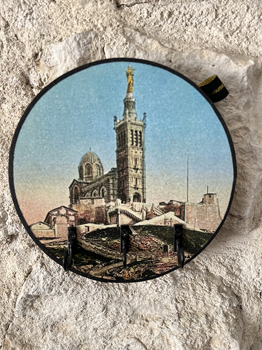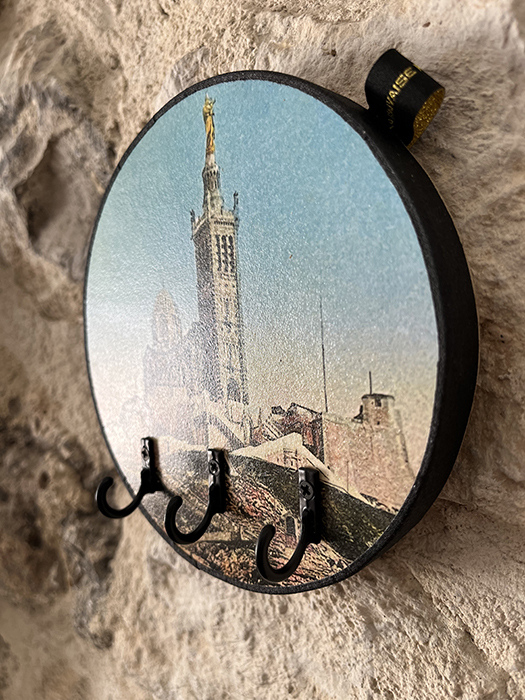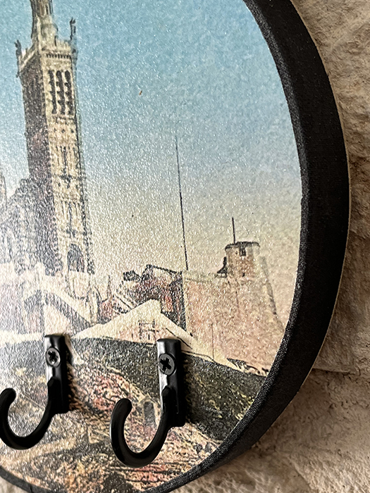 Porte Clés Mural en bois naturel de Paulownia. Recouvert au recto d’une reproduction d’une partie d’une carte postale vintage très ancienne retravaillée. Elle est ensuite vernis plusieurs fois. Et enfin cerclée de percale de coton noir. 3 accroches en métal noir. Idéal pour accrocher les trousseaux de clés dans l’entrée, les colliers, les câbles du téléphone, les petits torchons et bien d’autres utilisations.