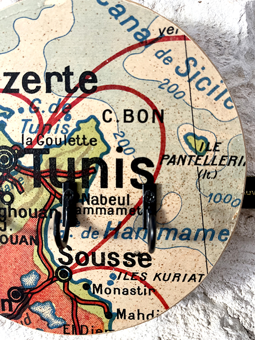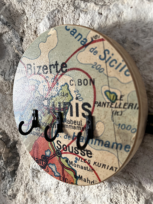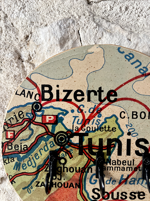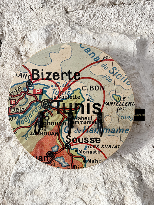 Porte Clés Mural en bois naturel de pin. Recouvert au recto avec une partie de carte scolaire ancienne originale. Chaque carte est chinée et de ce fait comporte quelques défauts et des petites taches dues à son âge. C’est bien l’original de la carte qui a été fixée sur le support. Celle ci est collée à la main et est UNIQUE. Elle est ensuite vernis plusieurs fois. Le contour du disque de pin est poncé pour une jolie finition. 3 accroches en métal noir. Idéal pour accrocher les trousseaux de clés dans l’entrée, les colliers, les câbles du téléphone, les petits torchons et bien d’autres utilisations.