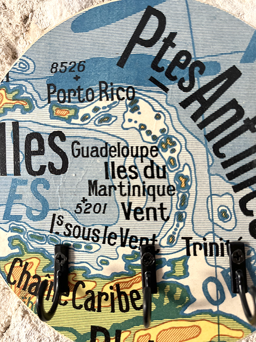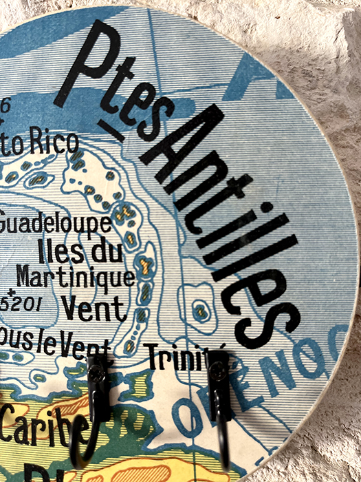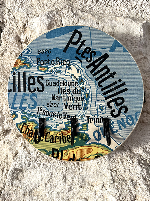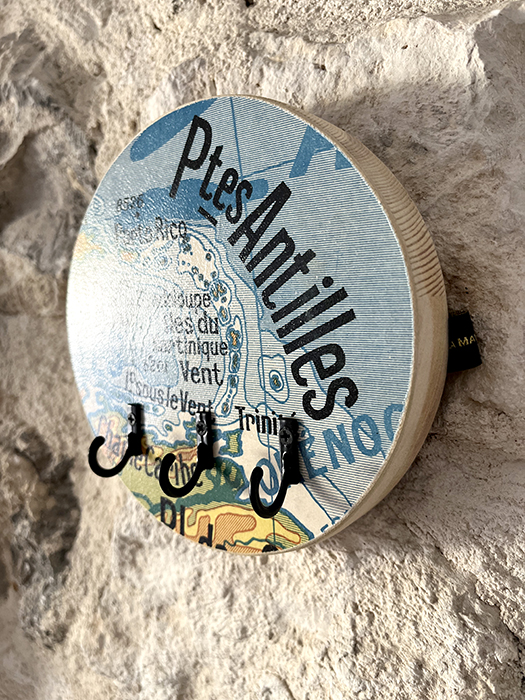 Porte Clés Mural en bois naturel de pin. Recouvert au recto avec une partie de carte scolaire ancienne originale.  Chaque carte est chinée et de ce fait comporte quelques défauts et des petites taches dues à son âge. C’est bien l’original de la carte qui a été fixée sur le support. Celle ci est collée à la main et est UNIQUE. Elle est ensuite vernis plusieurs fois. Le contour du disque de pin est poncé pour une jolie finition. 3 accroches en métal noir. Idéal pour accrocher les trousseaux de clés dans l’entrée, les colliers, les câbles du téléphone, les petits torchons et bien d’autres utilisations.