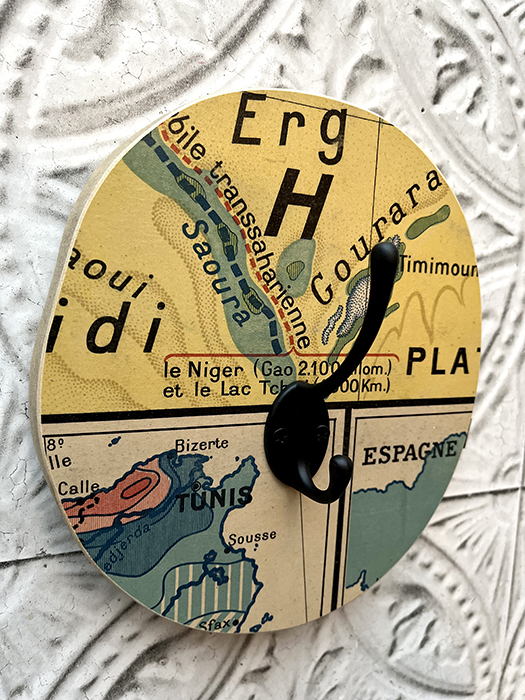 Porte-manteau en teck, bois certifié FSC. Recouvert au recto avec une partie de carte scolaire ancienne originale. Chaque carte est chinée et de ce fait comporte quelques défauts et des petites taches dus à son âge. C’est bien l’original de la carte qui a été fixé sur le support. Celle ci est collée à la main et est UNIQUE. Elle est ensuite vernis. Support en métal noir used.