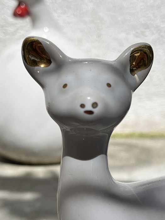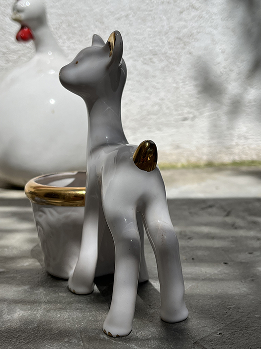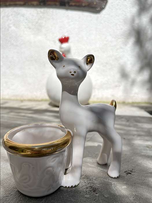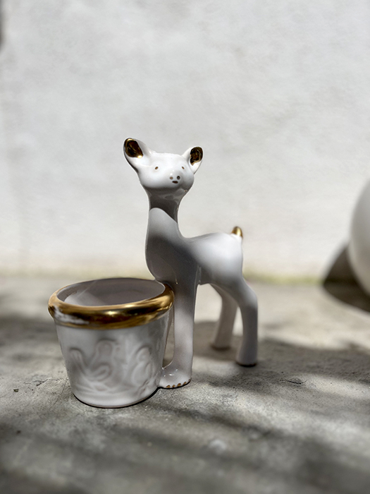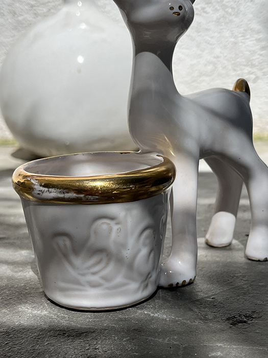 Petit pot Biche inspiration Vallauris. Blanc et doré. Quelques manque de doré sur le pot ( photo). Idéal petite plante grasse.