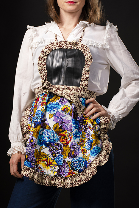 MAIS CETTE FOIS, J’ai collaboré avec la marque FANTOME. Cette jolie marque est spécialisée dans le recyclage de chambre à air. Cela nous à permis de réaliser ce tablier très Rock. La partie haute du tablier est en effet entièrement constituée de chambre à air. Du Recyclage au Surcyclage il n’ y qu’un pas que nous avons franchi avec bonheur. En bonus ce tablier est entièrement Vegan, une autre des valeurs fortes de FANTOME. Le Lien vers leur site, c’est ICI.