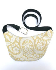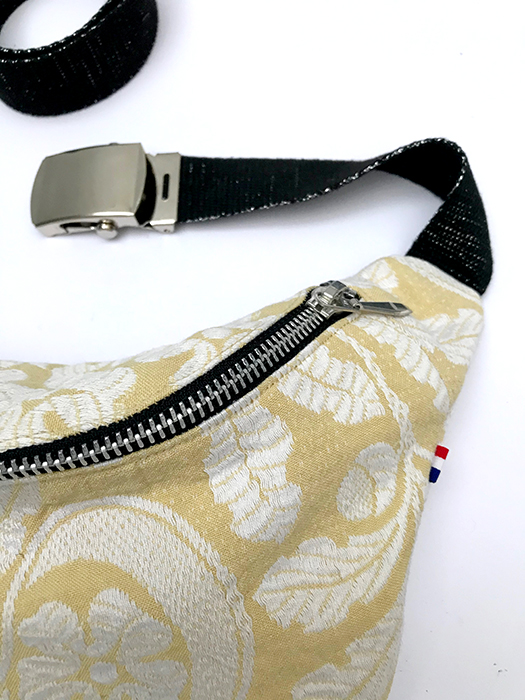 L’extérieur de celui ci est en tissus motif ancien jaune paille brodé blanc. Pour l’intérieur nous avons doublé le sac banane avec ce même tissus.