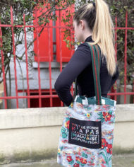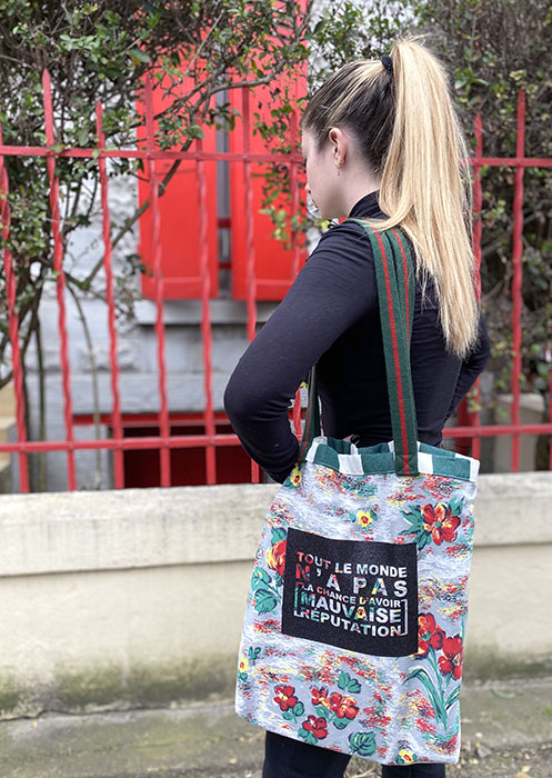 Sac besace assez grand, à porter sur l’épaule ou au coude. Comme toujours c’est une pièce unique avec un maximum de matériaux recyclés. Made in France, chaque pièce est réalisée à la main. Il est imprimé sur la face avant » Tout le monde n’a pas la chance d’avoir Mauvaise Réputation ». Et sur la face arrière du Logo. Les tissus, extérieurs et de la doublure sont issus de vieux tissus recyclés ou de fin de stock de grands fabriquants de luxe. À l’intérieur une grande poche reprend le tissu extérieur. Il a un fond d’environ 8 cm afin de pouvoir transporter plusieurs dossiers ou un ordinateur portable. Réversible.