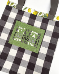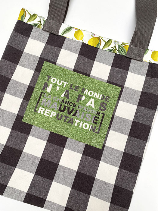 Sac besace assez grand, à porter sur l’épaule ou au coude. Comme toujours c’est une pièce unique avec un maximum de matériaux recyclés. Made in France, chaque pièce est réalisée à la main. Il est imprimé sur la face avant » Tout le monde n’a pas la chance d’avoir Mauvaise Réputation ». Et sur la face arrière du Logo. Les tissus, extérieurs et de la doublure sont issus de vieux tissus recyclés ou de fin de stock de grands fabriquants. À l’intérieur une grande poche reprend le tissu extérieur. Il a un fond d’environ 8cm afin de pouvoir transporter plusieurs dossiers ou un ordinateur portable. Réversible.