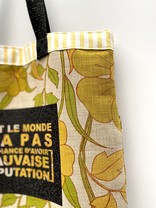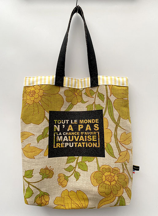 Sac besace à porter sur l’épaule ou au coude. Comme toujours c’est une pièce unique avec un maximum de matériaux recyclés. Made in France, chaque pièce est réalisée à la main. Il est imprimé sur la face avant » Tout le monde n’a pas la chance d’avoir Mauvaise Réputation ». Et sur la face arrière du Logo. Les tissus, extérieur et de la doublure sont issus de vieux tissus recyclés ou de fin de stock. À l’intérieur une grande poche reprend le tissu extérieur. Il a un fond d’environ 8cm afin de pouvoir transporter plusieurs dossiers ou un ordinateur portable. Réversible.