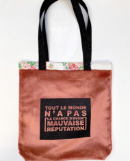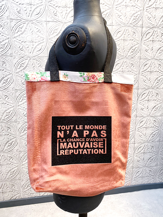 Sac besace assez grand, à porter sur l’épaule ou au coude. Comme toujours c’est une pièce unique avec un maximum de matériaux recyclés. Made in France, chaque pièce est réalisée à la main. Il est imprimé sur la face avant  » Tout le monde n’a pas la chance d’avoir Mauvaise Réputation ». Et sur la face arrière du Logo. Les tissus, extérieurs et de la doublure sont issus de vieux tissus recyclés ou de fin de stock de grands fabriquants de luxe. À l’intérieur une grande poche reprend le tissu extérieur. Il a un fond d’environ 8 cm afin de pouvoir transporter plusieurs dossiers ou un ordinateur portable. Réversible.