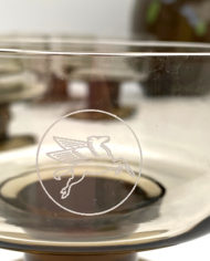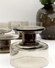 5 jolies coupes à champagne en verre de couleur gris fumé. Très bon état. Prix pour les 5. Logo Mobil sur le devant.