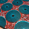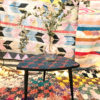 Ancienne table tripode, porte plante, bout de canapé. Forme triangulaire. Elle a été nettoyée et rénovée. Le dessus du plateau a été recouvert avec un tissus Wax dans les tonalités turquoises. Cerclée de percale de coton noir. Le dessus a été enduit de manière a ce u’il soit lessivable. Pieds compas en bois.