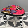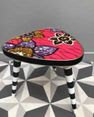 Table tripode ancienne, qui a été rénovée sur commande. Elle est donc vendue. Cette table tripode est recouverte d’un tissus Wax à tonalités rose . Le piétement a été restauré et repeint en noir et blanc à rayure. Pieds compas. Contour cerclé de percale de coton noir mat. Idéale en chevet ou bout de canapé, à l’aise partout comme petite table d’appoint.