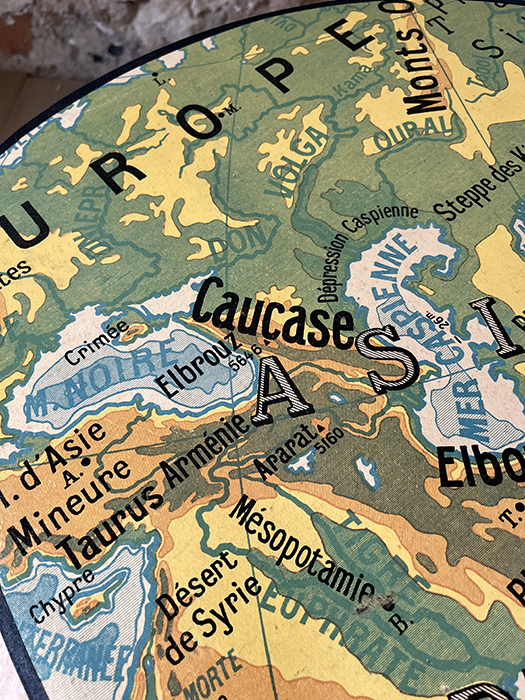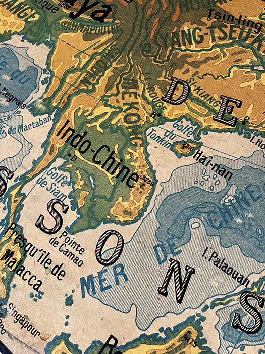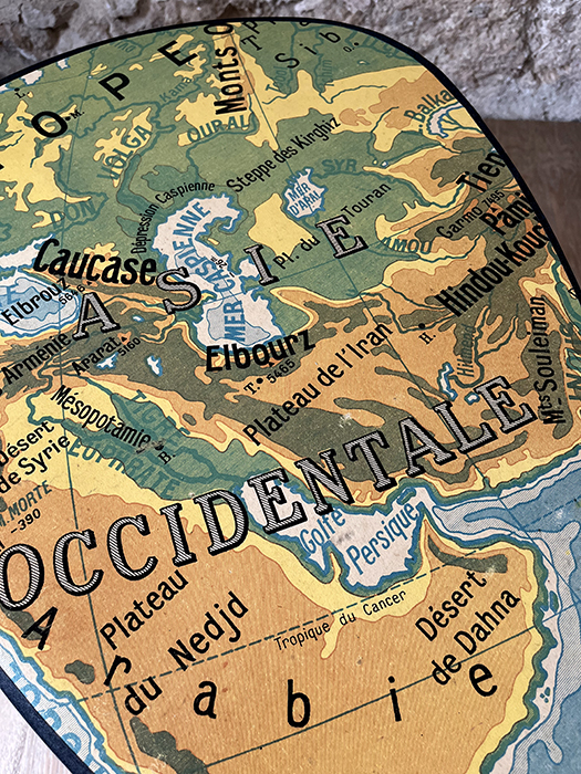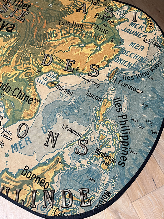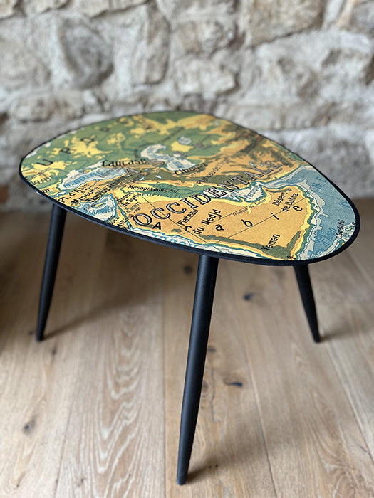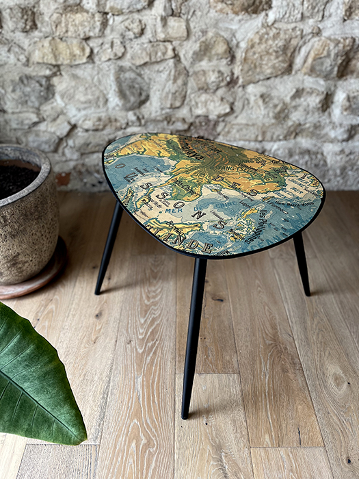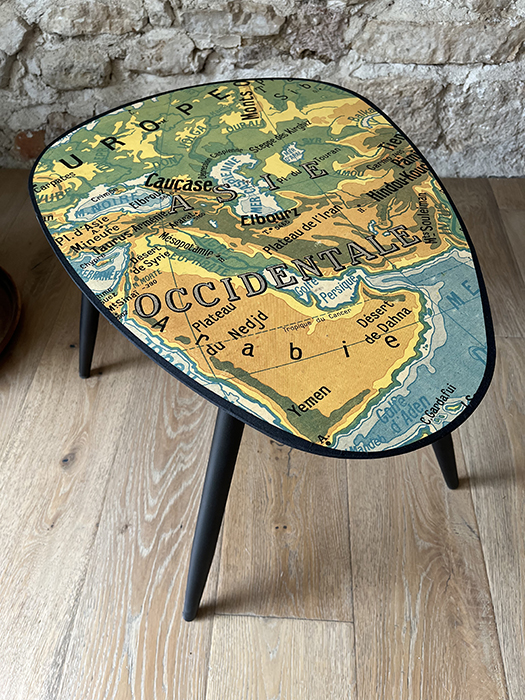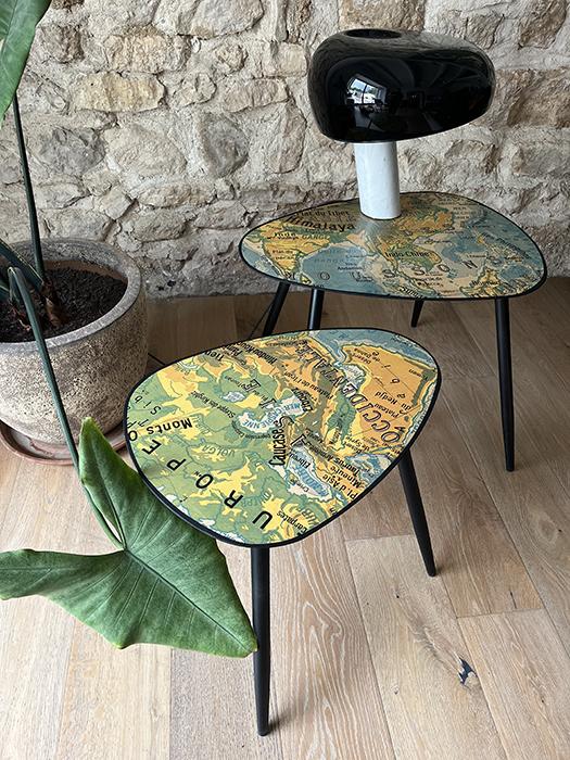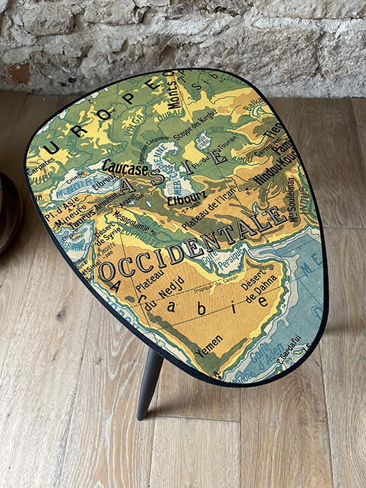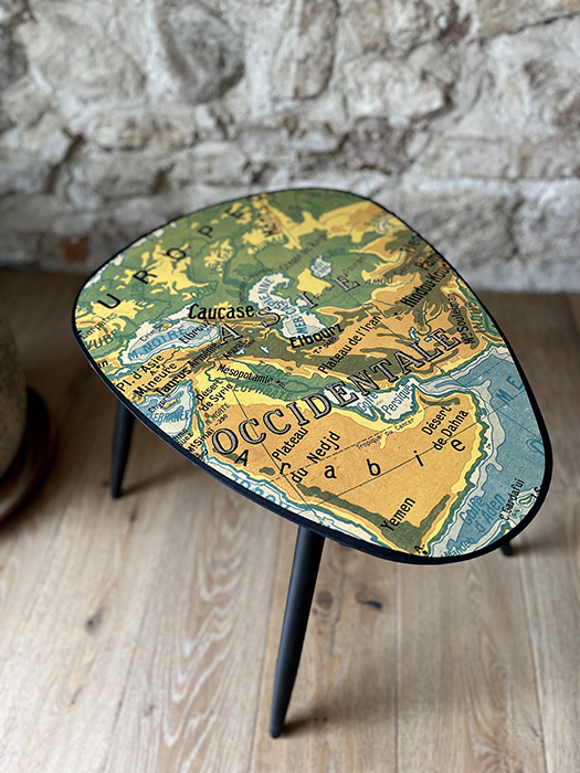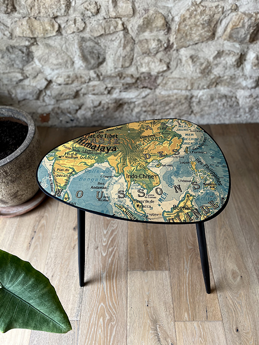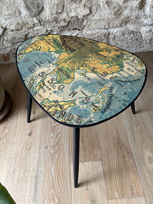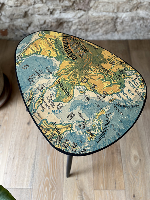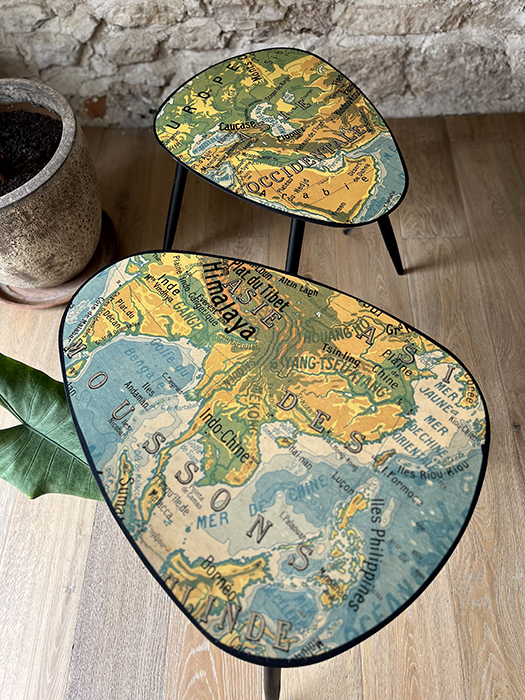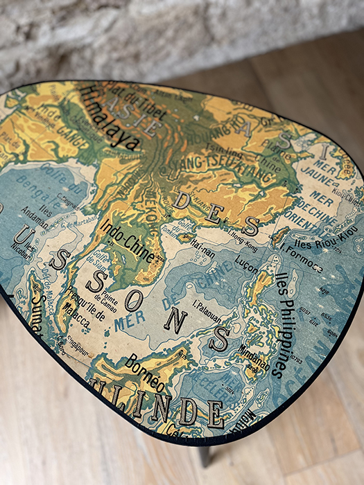 Ensemble de deux tables gigognes “VOUS ÊTES ICI”. Deux tables en acier entièrement rénovées. Les piétements ont été poncés et repeints en noir mat. Les plateaux ont été recouverts avec une carte scolaire vintage originale. Celle ci est une carte magnifique d’Asie Physique. Chaque carte est chinée et est ancienne. De ce fait elle comporte quelques défauts et des petites taches dus à son âge. C’est bien l’original de la carte qui a été fixé sur les tables. Celles ci sont recouvertes à la main et sont UNIQUE. Les plateaux ont ensuite été cerclés de percale de coton noir mat et re-vernis. Ces tables sont donc lavables. Elles restent cependant une pièce artisanale à manipuler avec soin. Ne convient pas pour un usage très intensif.