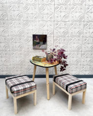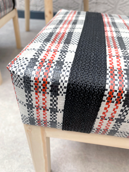 L’assise est faite elle aussi entièrement à la main et constituée d’une planche en bois, une mousse haute densité bultex, une ouate et un « tissu » nylon plastifié provenant d’un cabas dans les tonalités graphique noir blanc et rouge. Il est cousu au plus proche de la mousse puis agrafé sous l’assise.