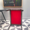 L’assise est faite entièrement à la main et constituée d’une planche, une mousse haute densité, une ouate et un tissus d’ameublement rouge et beige. Le tissus est cousu au plus proche de la mousse puis agrafé sous l’assise.